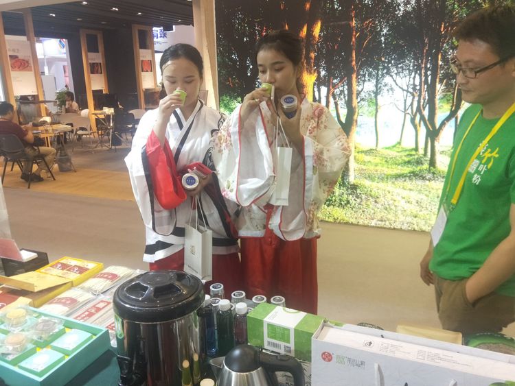 (兩位裝著特色服裝的美女在試喝藥業(yè)的主打產(chǎn)品:淡竹葉粉固體飲料)